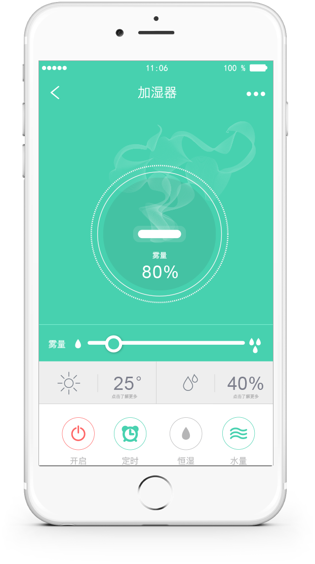 無論躺著(zhe)、坐著(zhe)還是癱著(zhe),通過手機就能(néng)調節加濕器(qì)的(de)噴霧量大(dà)小(xiǎo),在APP界面滑動手指即可(kě),既簡單又(yòu)方便。